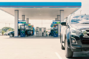 Car parked in a gas station in Thailand.